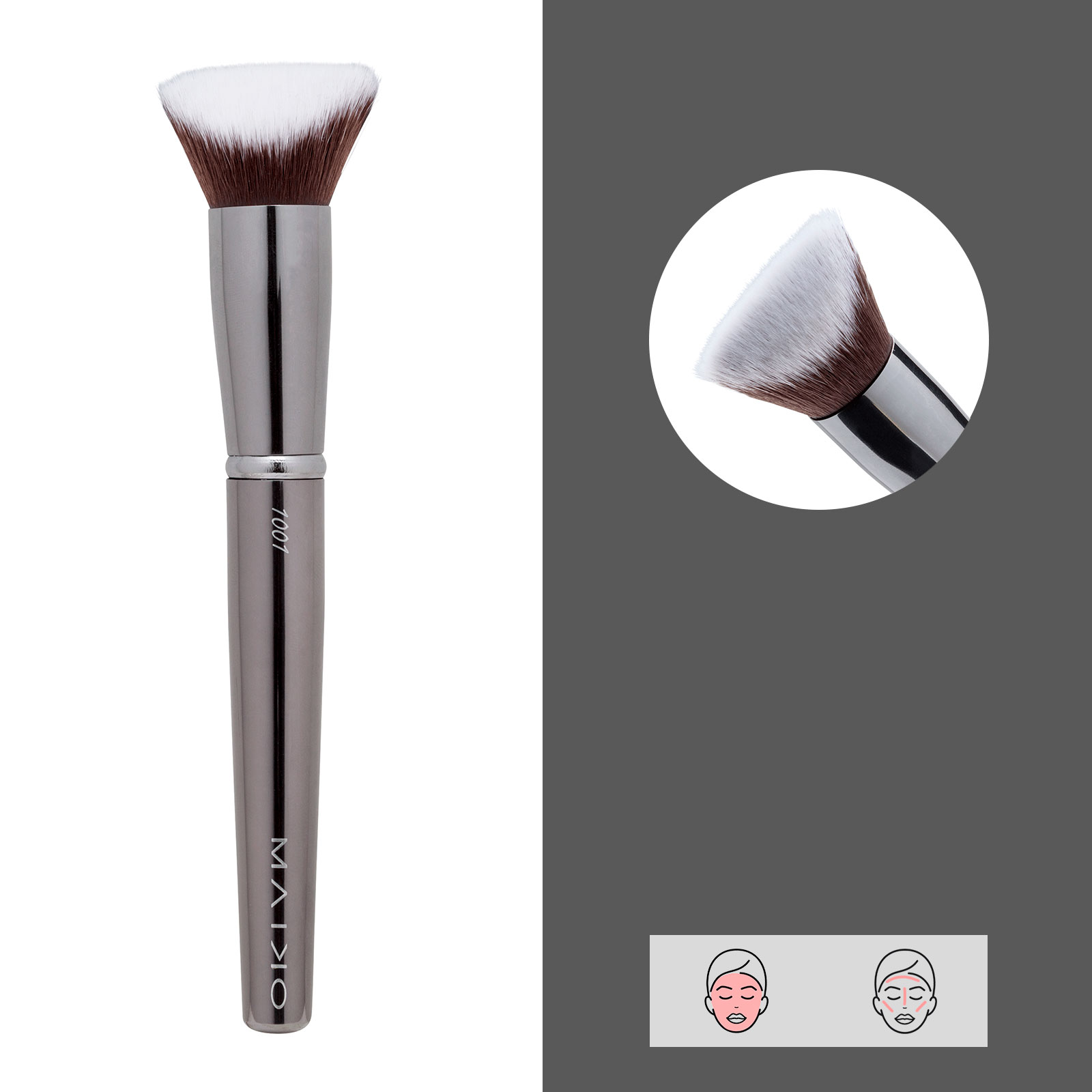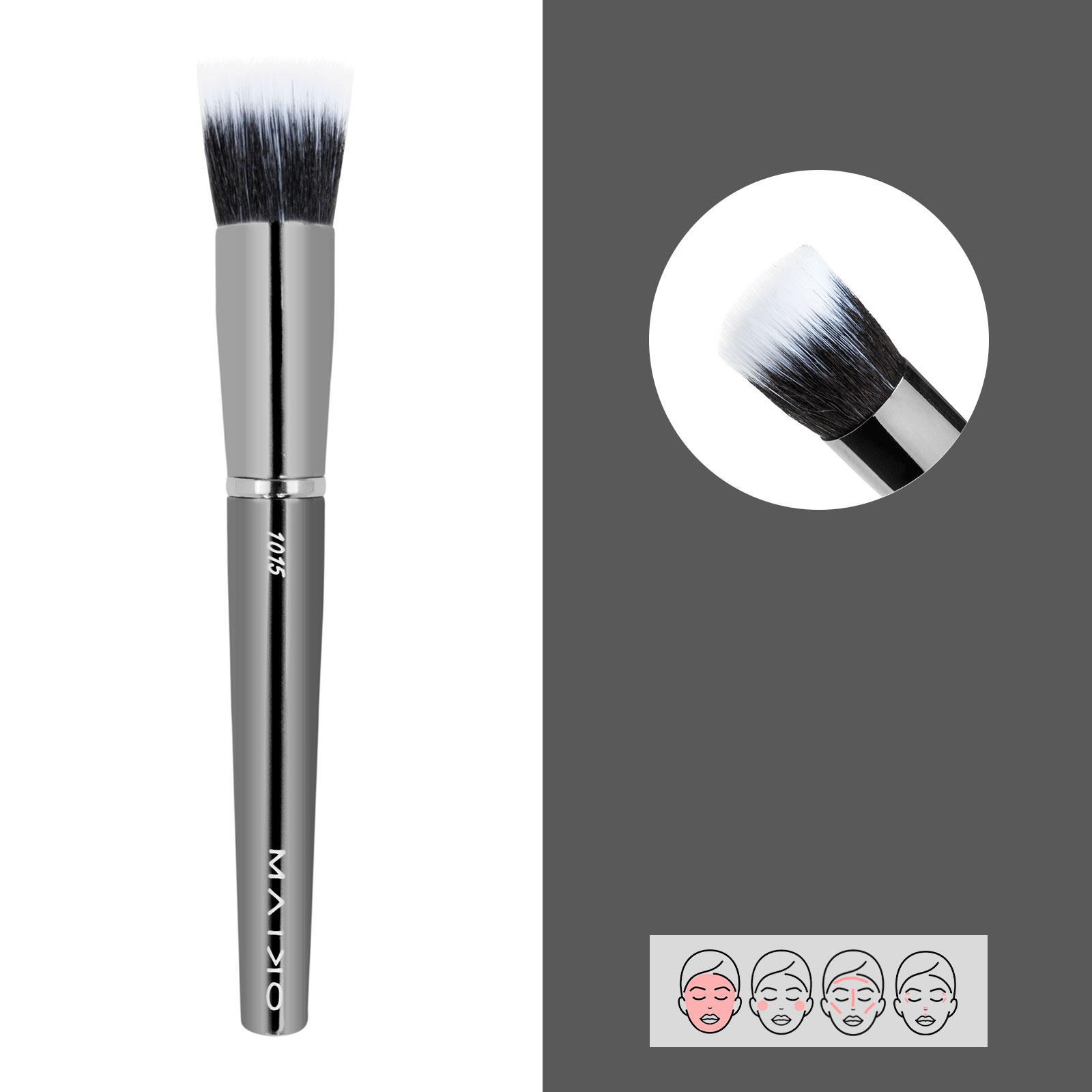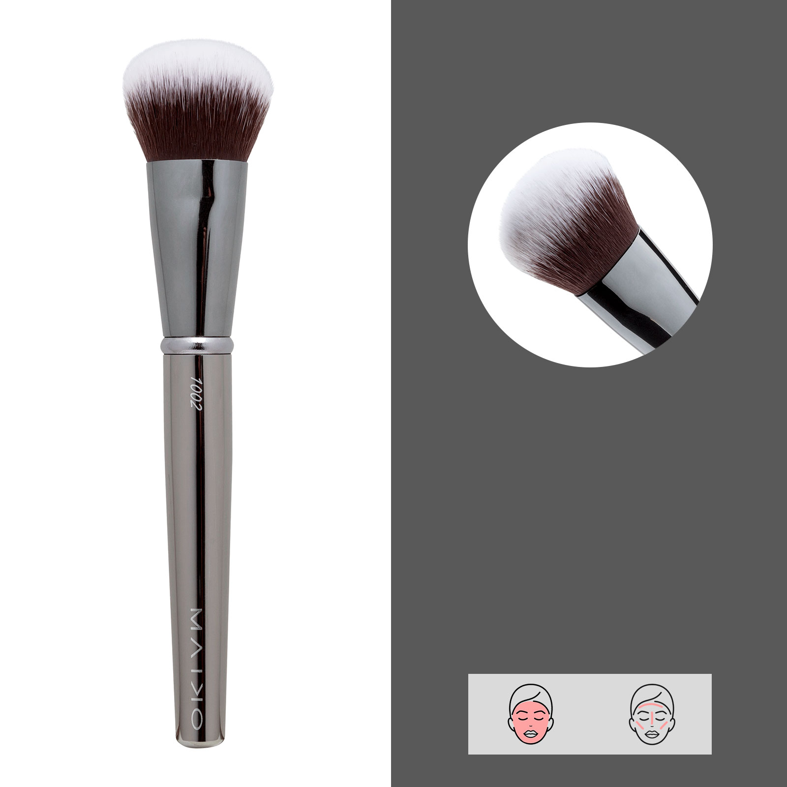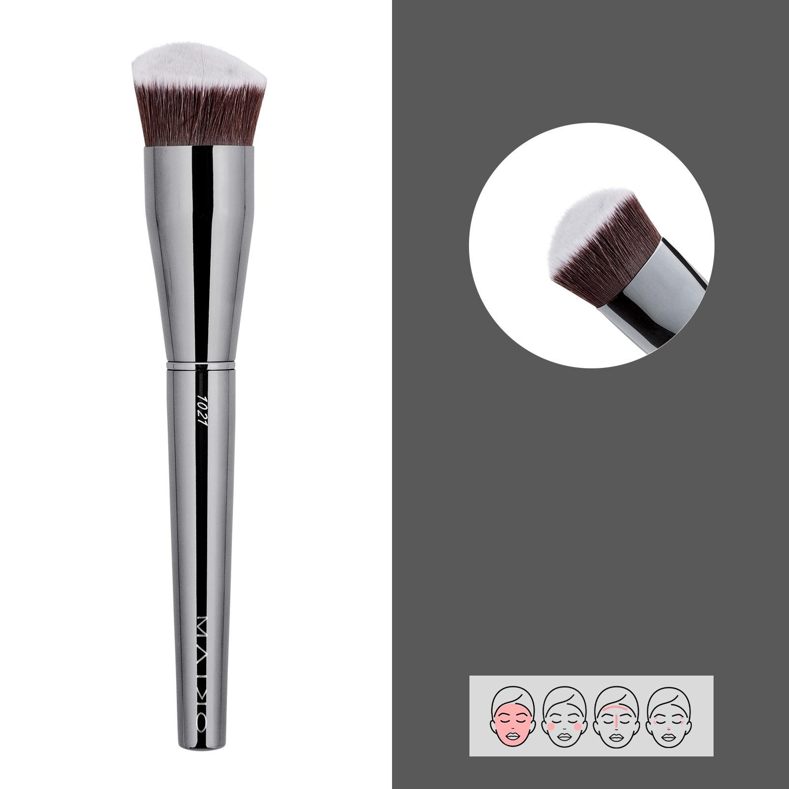 Aplicación de la base de maquillaje en distintas texturas como fluida o cremosa. Brocha de pelo sintético.