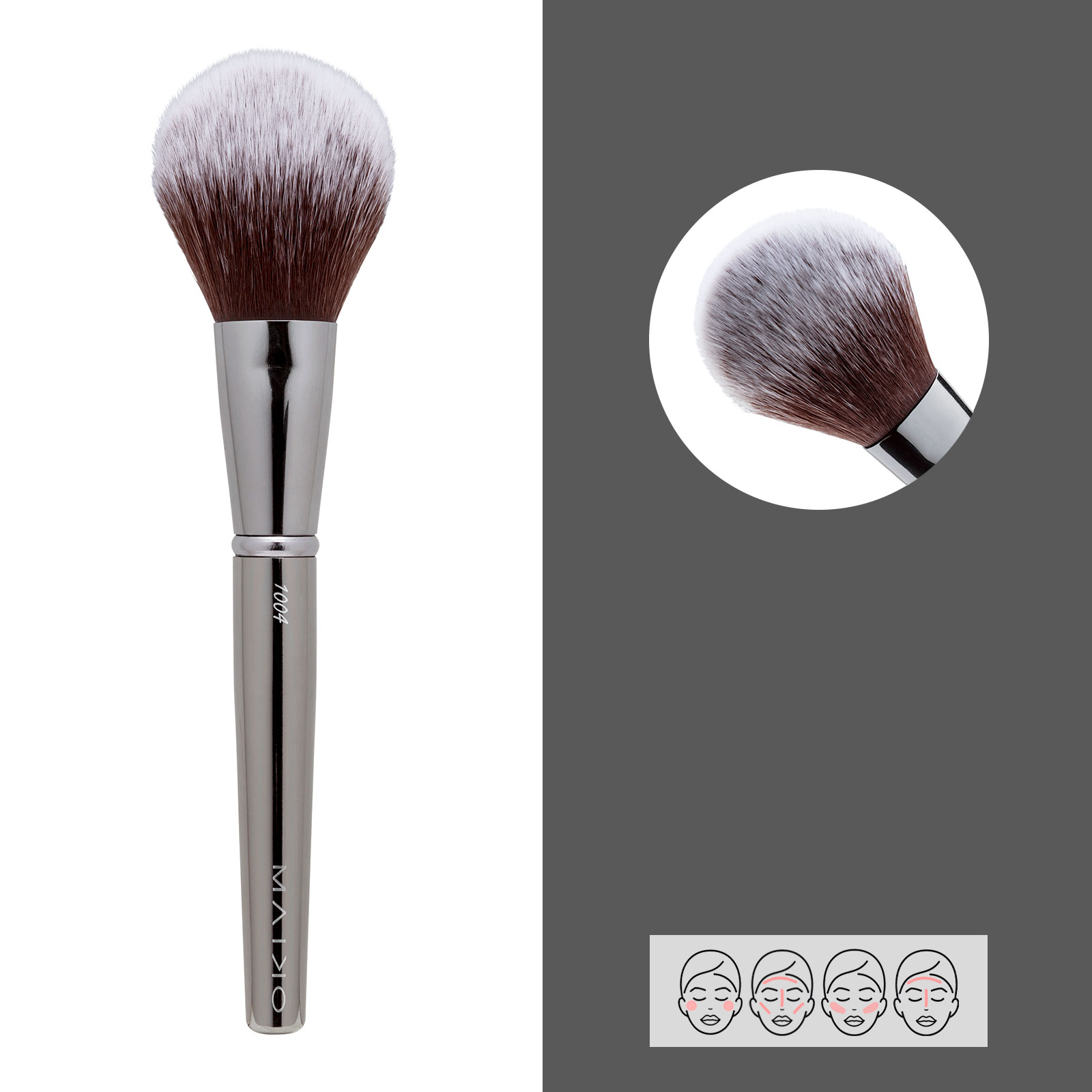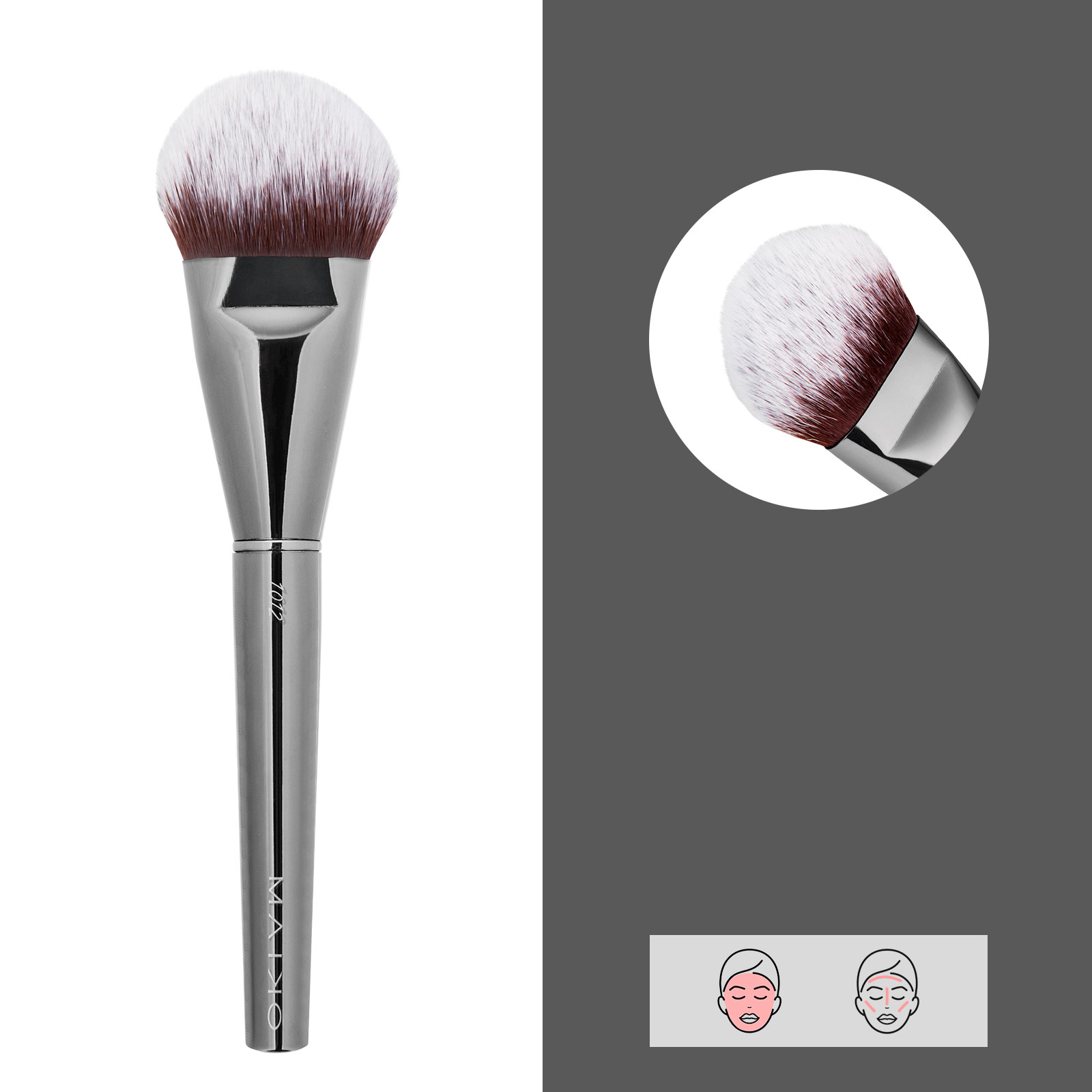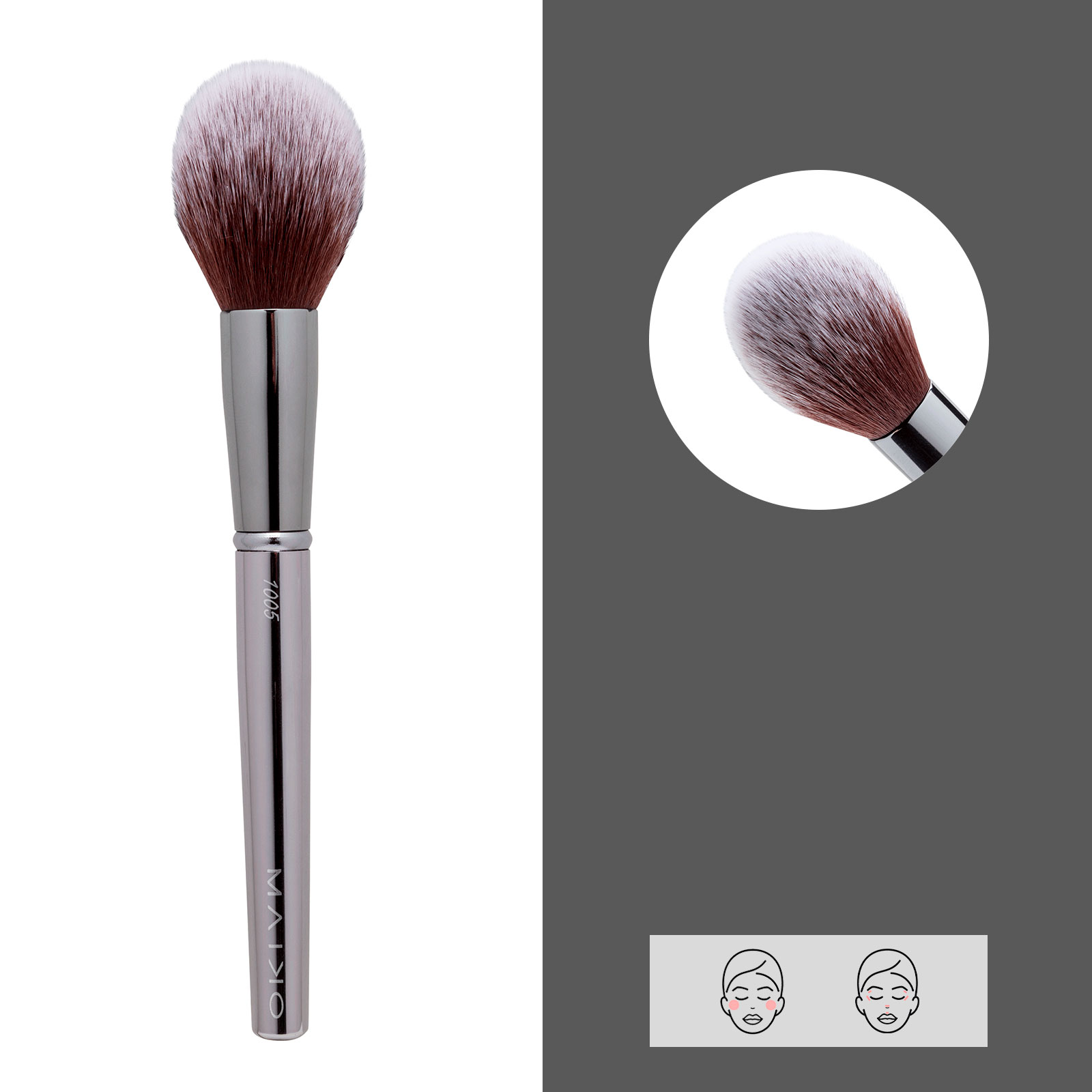 Brocha para rostro de forma cónica, de fibras largas y suaves que permite la aplicación de productos en polvo. De uso versátil para coloretes, bronceadores, iluminadores y polvos fijadores. Pelo sintético.