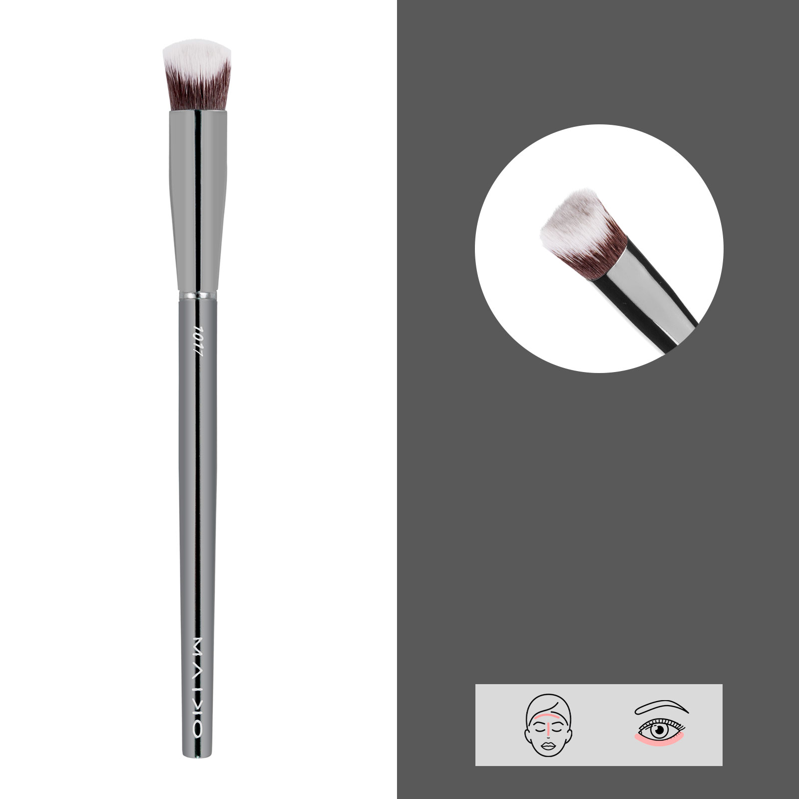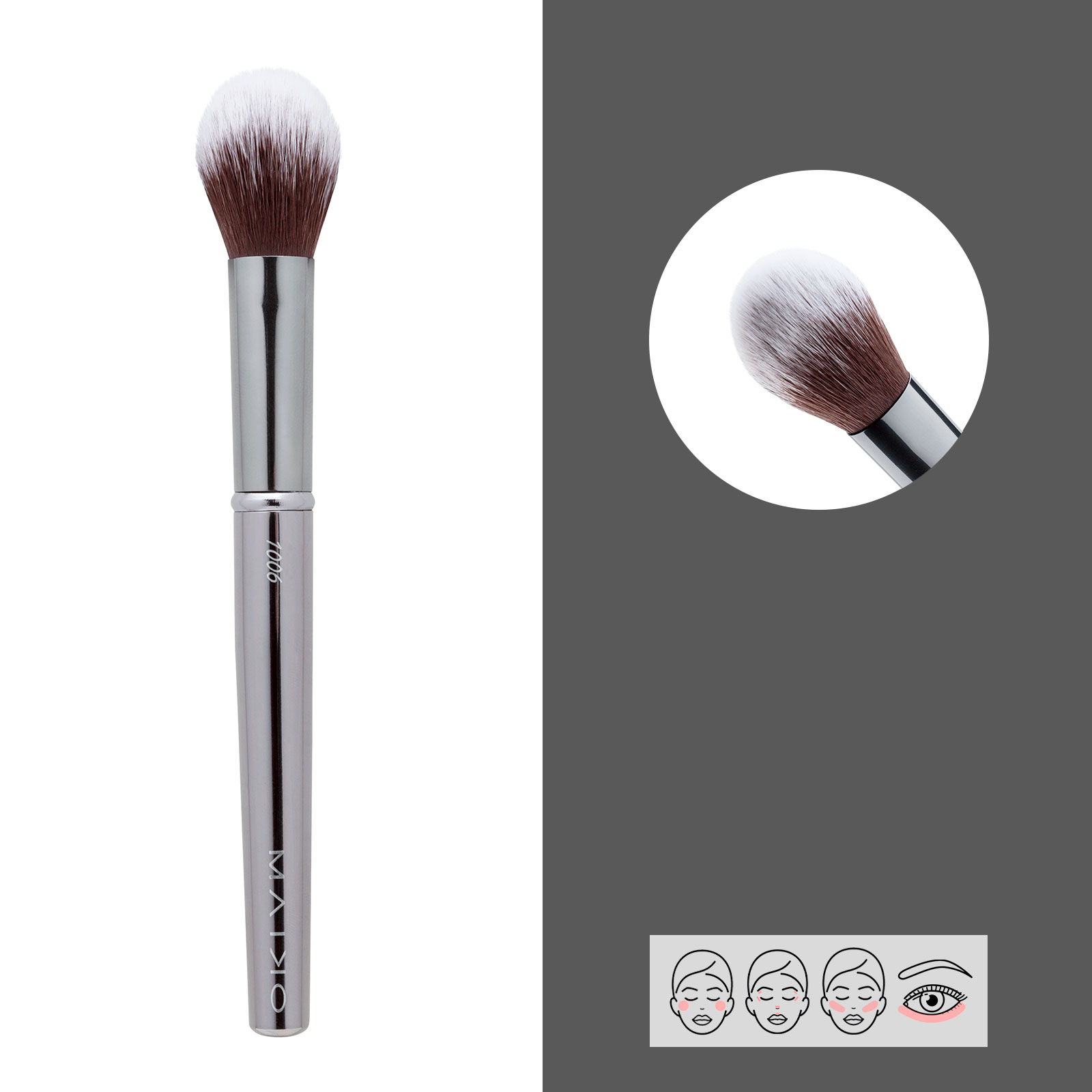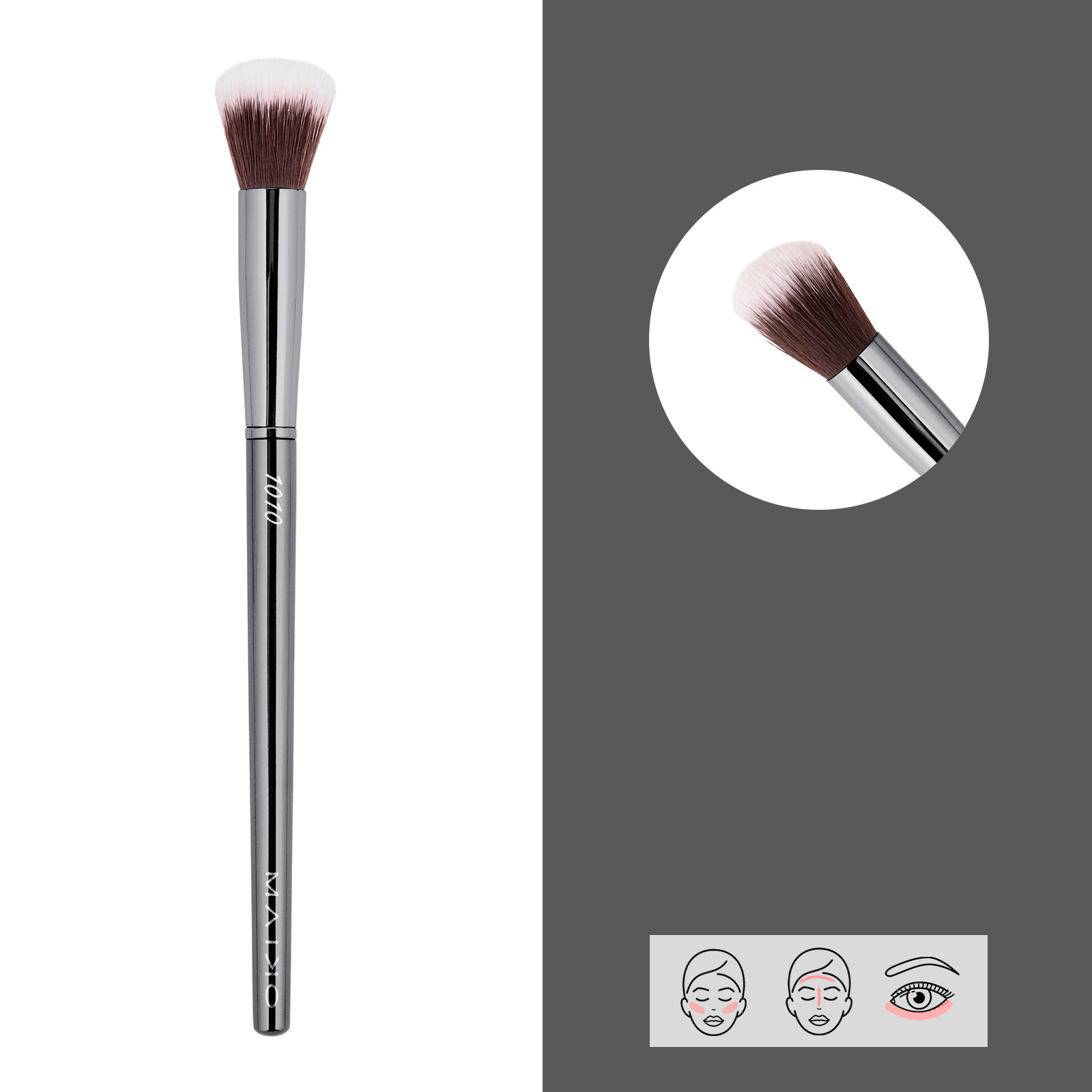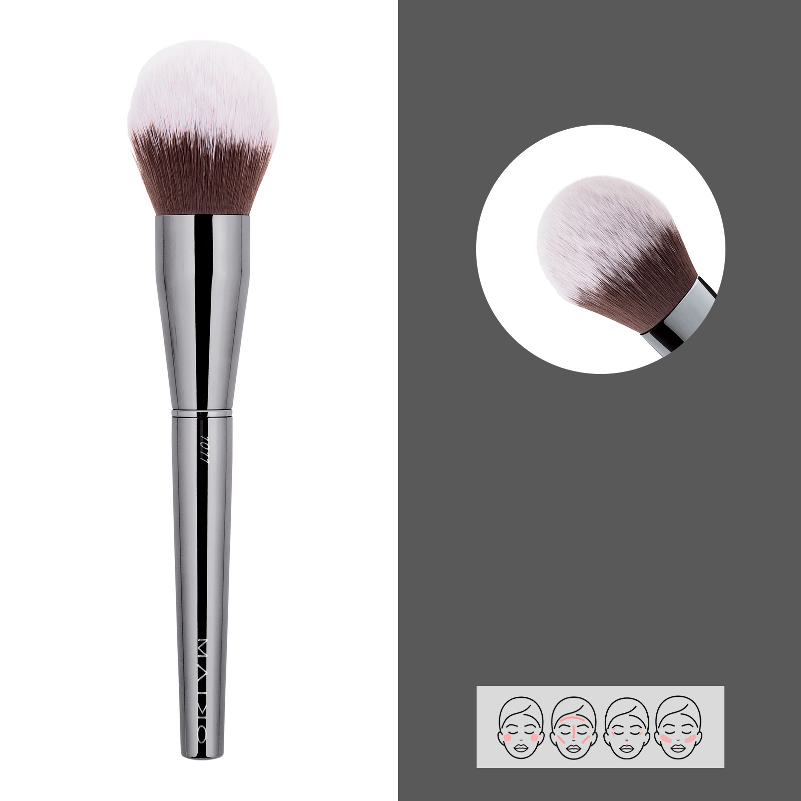 Proporciona una fácil aplicación de productos en polvo en zonas más concretas. Gracias a la densidad de sus fibras, el producto puede difuminarse con facilidad. Brocha de pelo sintético.