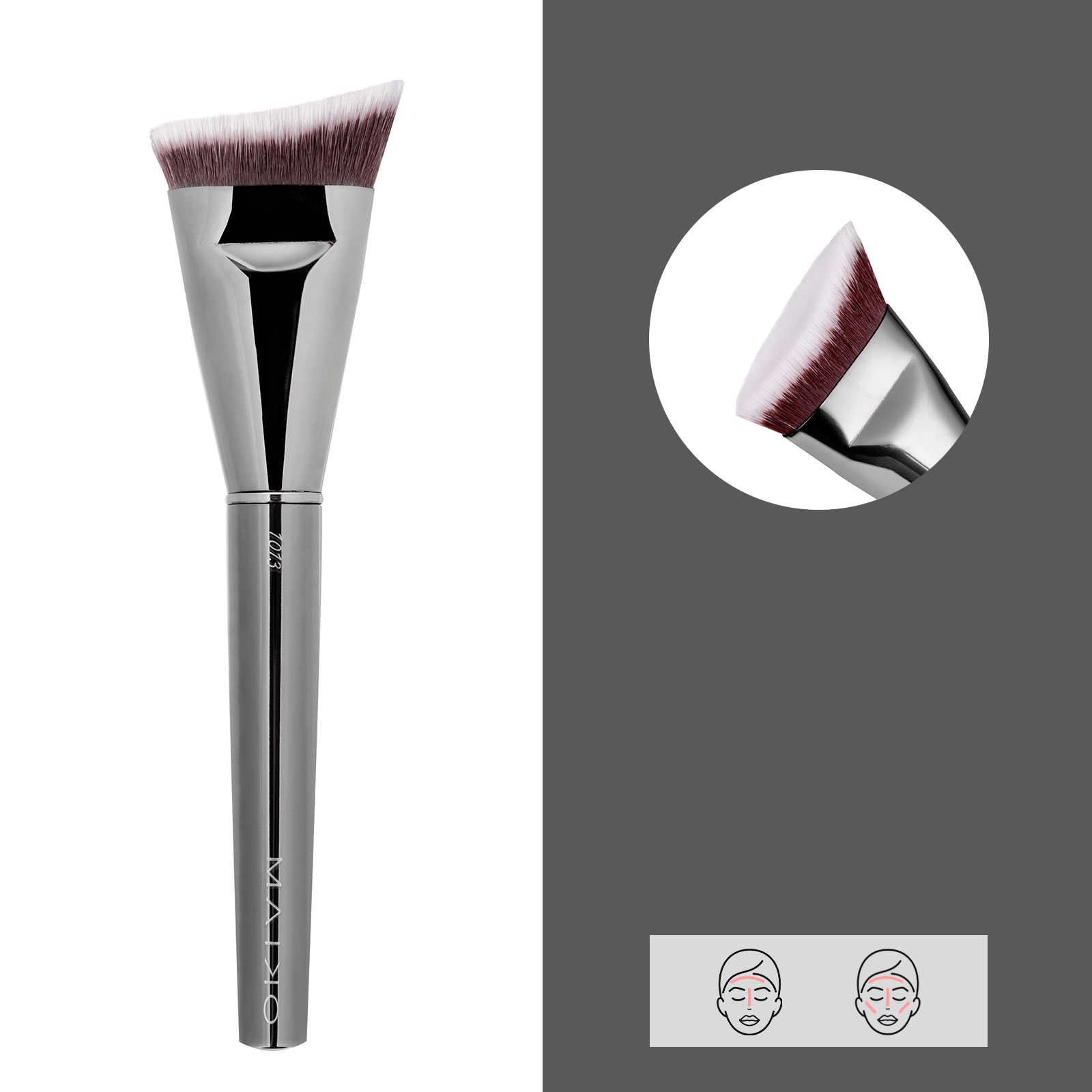 Gracias a su corte angular, aplica productos fluidos de un modo más preciso en zonas del rostro de difícil acceso. Brocha de pelo sintético.