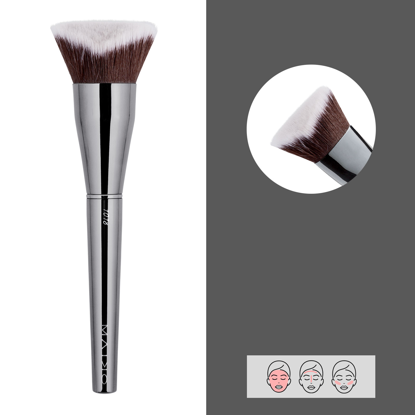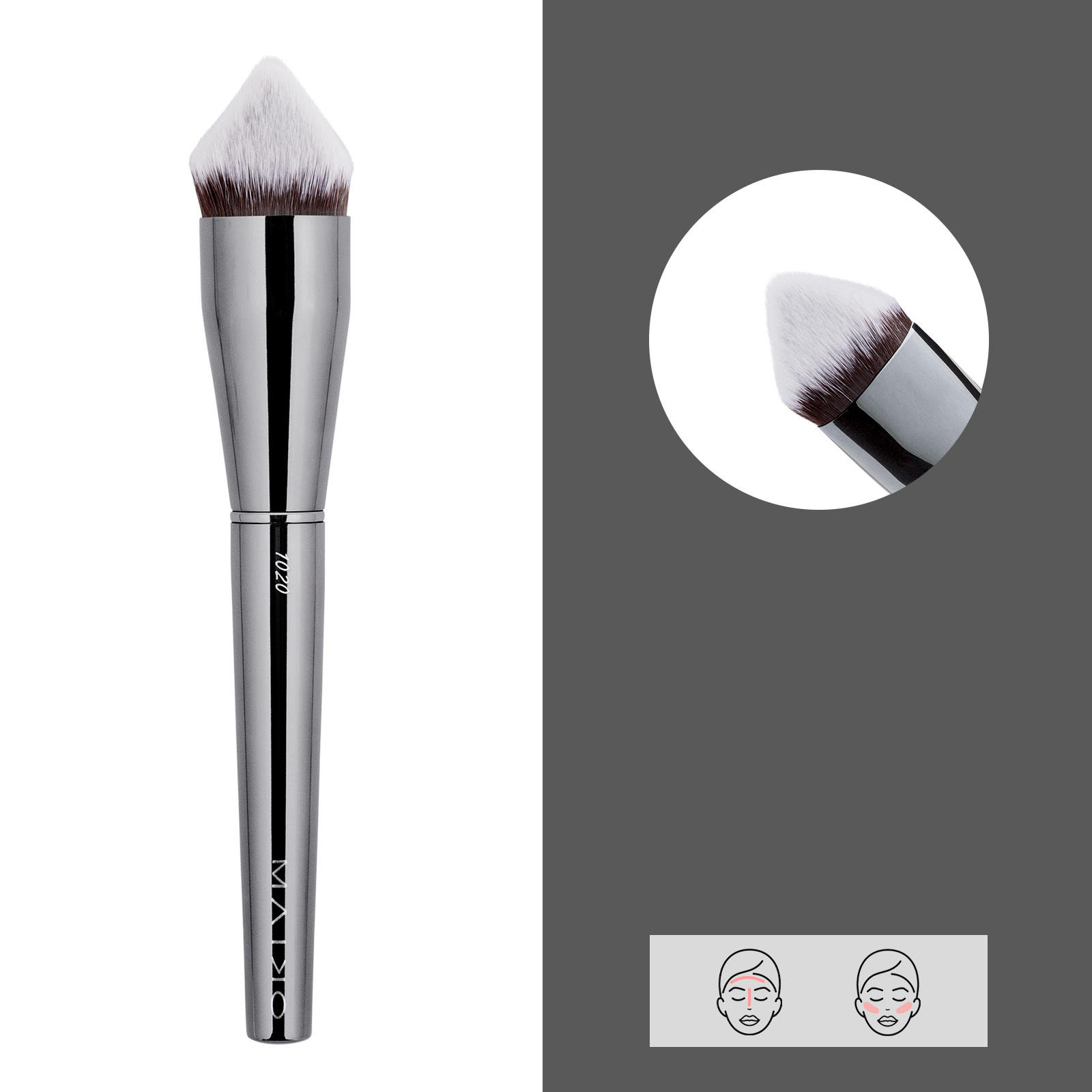 Brocha de forma única, multifuncional, para cubrir todas las áreas del rostro con maquillaje líquido, en crema o en polvo. Acabado uniforme y preciso. Ideal para corregir, maquillar, modelar e iluminar. Pelo sintético.
